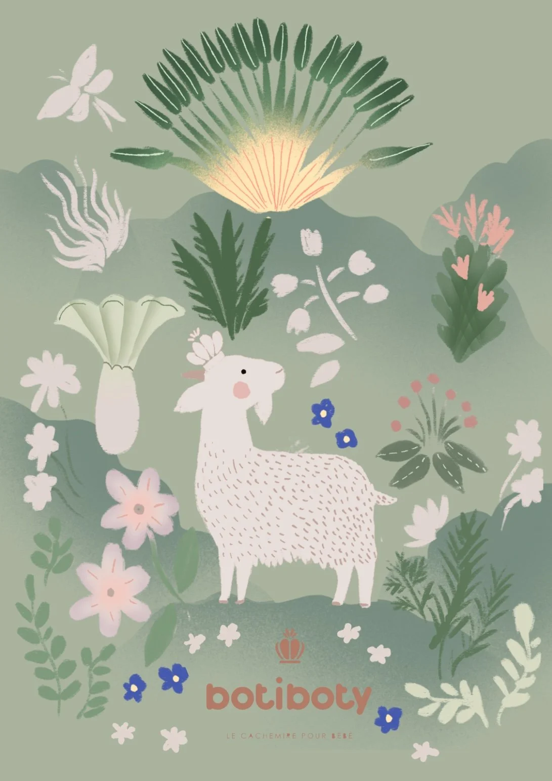 For the art print, I was asked to include a goat, from which cashmere is made, as well as the traveler’s tree, one of Madagascar’s important symbols. The illustration has later been printed as an A5 print, to be included as a gift in every order!